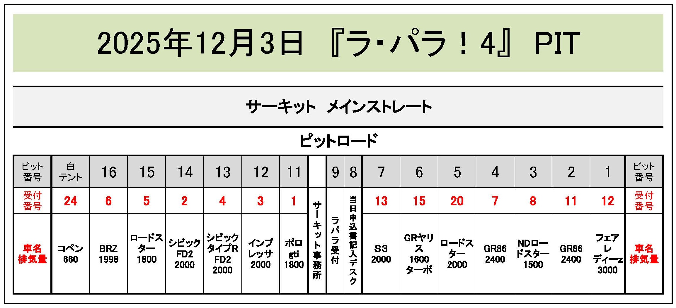 | ★入金確認サイト(入金確認できた方の受付番号を掲載しています) ★ マイナ免許証の方へ:アプリで免許証番号等を表示してから受付へお越し下さい。表示画面を画像として保存したものでも結構です。 ■2025/12/01 12月3日『ラ・パラ!4』時間変更について ・ゲートオープン 7:40 少し早めに入場できます! ・ミーティング 8:20 ・屋根下PITピット割り 下の『次回開催情報』にアップしました ■2025/11/25 12月3日『ラ・パラ!4』振込完了の皆さま: 受付番号を「入金確認できました」サイトにアップ済みです ■2025/10/03『10月2日ラ・パラ!4』①フォトアップ ②ランキング更新 ランキング参加方法・ルールについてはここをクリック! ■2025/10/02 10月2日「ピット割り」下の◆次回開催情報◆にアップ ■2025/10/01「2025年度 スポーツ安全保険」加入者名簿アップ ・10月1日までに振込済でお名前がない方は至急事務局までご連絡ください。 ■2025/09/21『8月13日ラ・パラ!4』走行写真を送っていただきました!フォトアルバムのリンクからDLできます! ■2025/08/11 ①『ラ・パラ!4』ルールマナー解説書できました! ② スーパーランキングのサイトできました。6月17日ランキング 公開! ■2025/01/24 2025年変更点・年間スケジュール アップ ★2024/12/31 2024シーズンのお礼 &2025年も応援お願いいたします! |