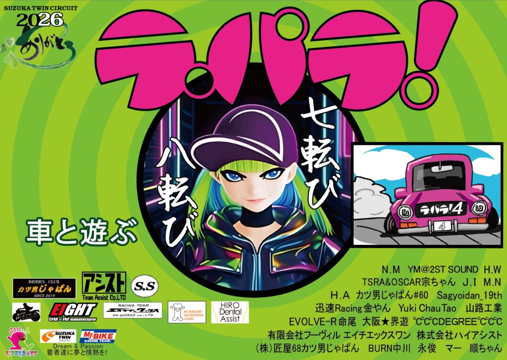 | 3月24日(火) 『ラ・パラ!4S』 鈴鹿ツインサーキット Dコース(グリップ走行) ★マイナ免許証の方へ:アプリで免許証番号等を表示してから受付へお越し下さい。表示画面を画像として保存したものでも結構です。 ★ 当日エントリーのみ。直接会場受付へお越し下さい。 ★ 回数券(3回券)を販売。購入当日から使用できます。 ★ ゲートオープン8:00 ★ 受付終了8:25 ★ ミーティング8:30 4月15日(水) 『ラ・パラ!4』 鈴鹿ツインサーキット フルコース ★マイナ免許証の方へ:アプリで免許証番号等を表示してから受付へお越し下さい。表示画面を画像として保存したものでも結構です。 ★ ゲートオープン8:00(雨天時は8:00) ★ 受付 8:00~8:25 ★ ミーティング 8:30 ★ 事前エントリー:3月中旬受付開始! ★ 当日エントリーOK!直接会場受付へ ★ 事前優先ピット割り: 前日朝までにこちらにアップします。 |