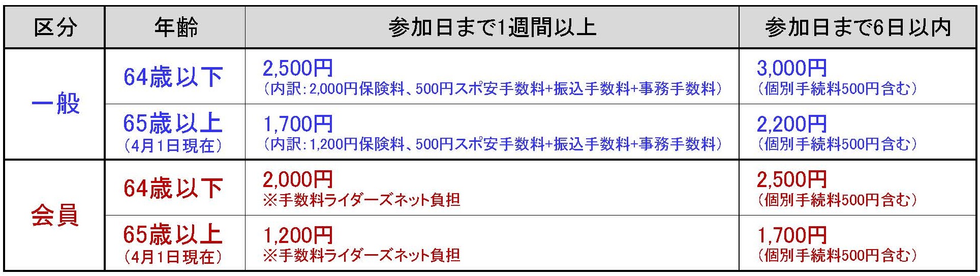 | 参加日の1週間前(開催日 1週間前の同曜日。日曜開催なら1週間前の日曜日) ※ライダーズネットが取りまとめて掛金を支払うため、補償開始までに日数が掛かります。開催まで1週間を切ると、担当者の出張や金融機関の休みのため加入できない場合があります。 【開催日まで1週間を切っていたら・・・】 1)振り込む前に間に合うかどうか事務局へ確認 2)間に合う場合は個別加入料500円をプラスし至急振り込み (確認なしの振込は、加入できていない場合があります) |